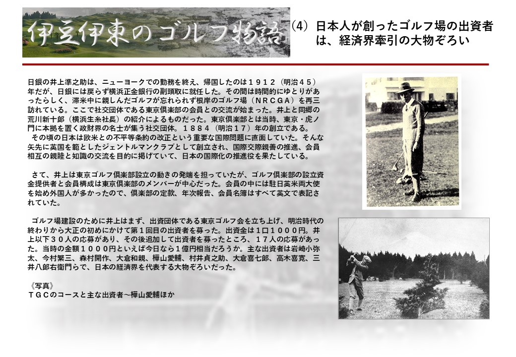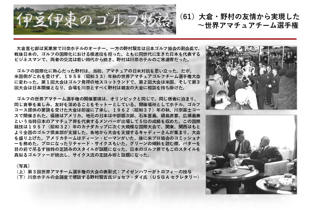 この伊東には古くから東洋一といわれたリゾートホテルがあり、36ホールの名コースもある。戦後には伊東市を中心に多くのゴルフコースが建設され、大勢のゴルファ―が訪れるようになり、日本のゴルフは伊東で育てられた一面もある。